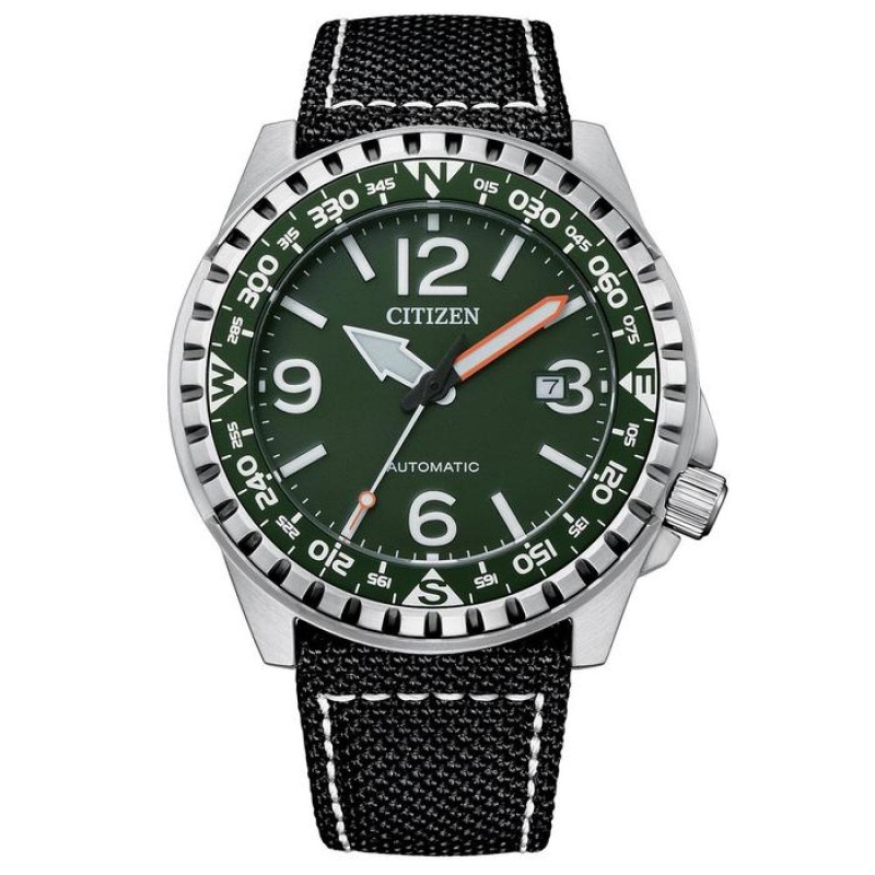 Cassa in acciaio , con ghiera girevole bidirezionale dal diametro di 46 mm. Quadrante verde con indici e sfere in bianco e luminor. Ghiera interna nera. Datario a ore 3. Vetro Minerale. Movimento: meccanico a carica automatica con funzione solo tempo e data. Cinturino in nylon lavorato nero con chiusura ad ardiglione. Impermeabilità 10 ATM.