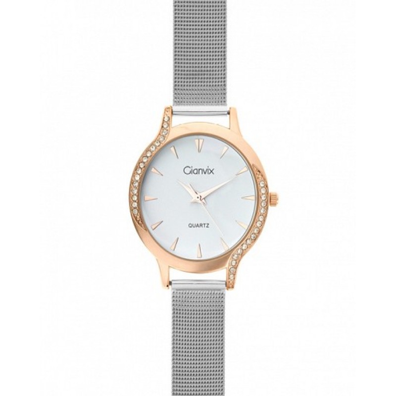 Orologio donna con movimento al quartz. Cassa color oro rosa diametro 35 mm. Corona a pressione. Fondello a pressione. Lunetta con riporti di strass bianchi. Quadrante silver con sfere e indici color oro rosa. Bracciale tessito. Orologio autentico, garanzia 24 mesi e scatola Gianvix. L'orologio è accompagnato da scontrino fiscale