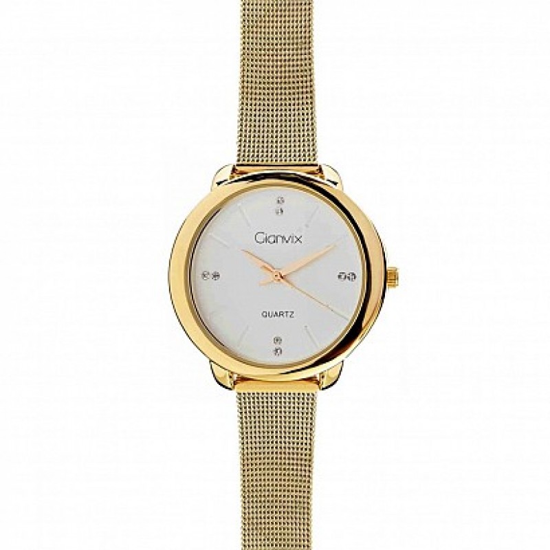 Orologio donna con movimento al quartz. Cassa diametro 35mm. Corona serrata a pressione. Fondello a pressione. Quadrante bianco con sfere color dorato e indici incisi e di strass. Bracciale tessito. Orologio autentico, garanzia 24 mesi e scatola Gianvix. L'orologio è accompagnato da scontrino fiscale