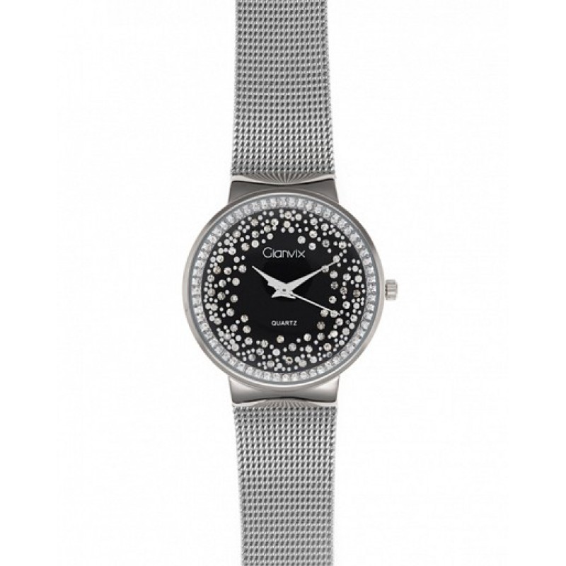 Orologio donna con movimento al quartz. Cassa diametro 34mm. Corona  a pressione. Fondello a pressione. Quadrante nero tempestato di strass. Sfere color silver. Lunetta sottovetro con zirconi bianchi. Bracciale tessito con chiusura scorrevole a scatto. Orologio autentico, garanzia 24 mesi e scatola Gianvix. L'orologio è accompagnato da scontrino fiscale