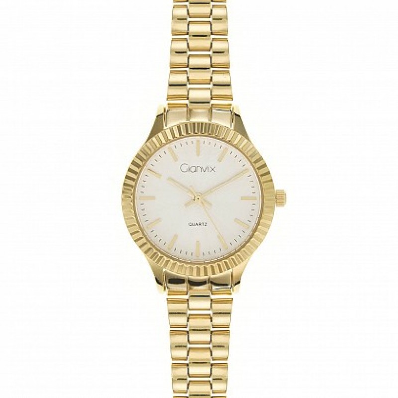 Orologio donna con movimento al quartz. Cassa diametro 30mm. Corona a pressione. Fondello a pressione. Lunetta zigrinata. Quadrante silver con indici color oro. Sfere color oro rosa e luminescenti. Bracciale in acciaio. Orologio autentico, garanzia 24 mesi e scatola Gianvix. L'orologio è accompagnato da scontrino fiscale
