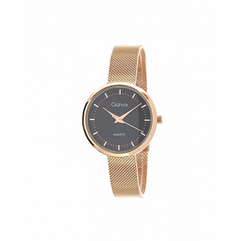 Orologio donna con movimento al quartz. Cassa in metallo color oro 30mm. Corona serrata a pressione. Fondello a pressione. Quadrante nero con sfere e indici color oro rosa. Bracciale tessito. Orologio autentico, garanzia 24 mesi e scatola Gianvix. L'orologio è accompagnato da scontrino fiscale