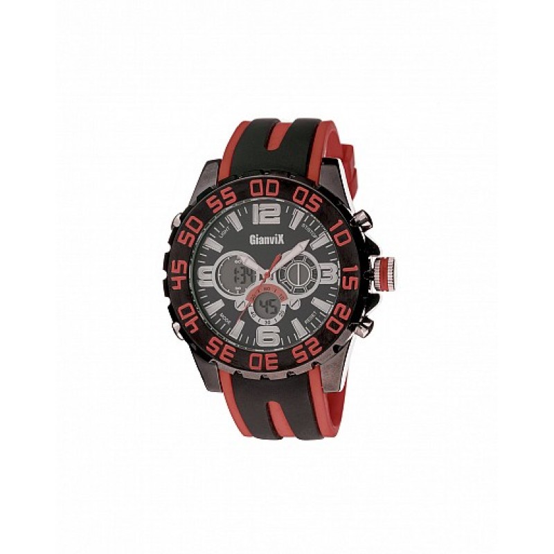 Orologio uomo analogico e digitale movimento al quartz. Cassa in metallo brunito 48 mm. Corona e fondello a pressione. Ghiera fissa con i numeri smaltati. Chrono alarm e luce. Numeri e indici bianchi. Sfere luminescenti. Cinturino in caucciù rosso e nero con fibbia in metallo. Orologio autentico, garanzia 24 mesi e scatola Gianvix. L'orologio è accompagnato da scontrino fiscale