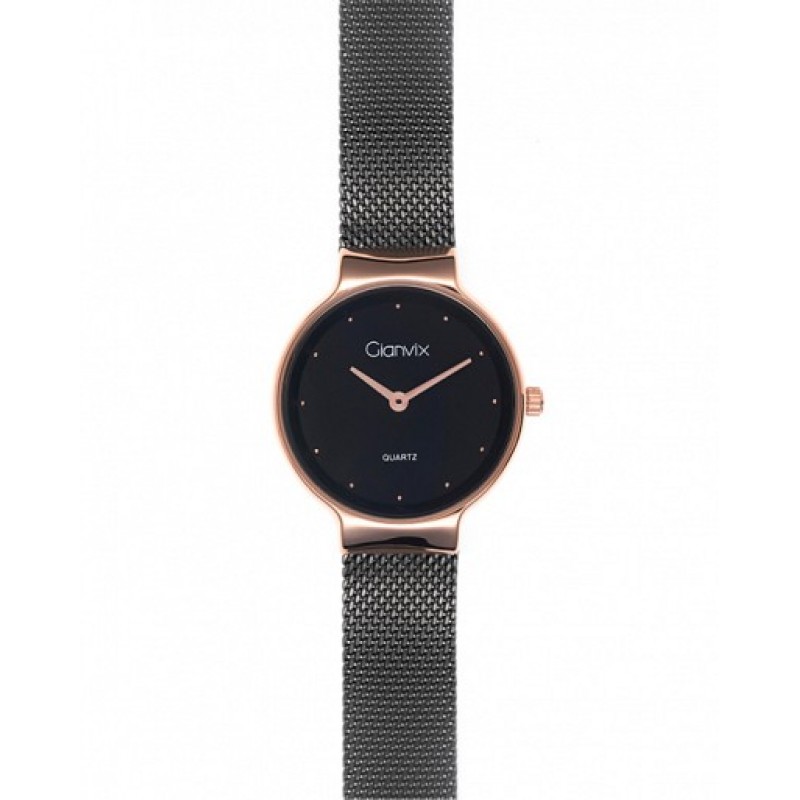 Orologio donna con movimento al quartz. Cassa color oro rosa diametro 30 mm. Corona a pressione. Fondello a pressione. Quadrante nero con sfere e indici color oro rosa. Bracciale tessito . Orologio autentico, garanzia 24 mesi e scatola Gianvix. L'orologio è accompagnato da scontrino fiscale
